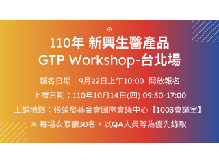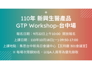 110年新興生醫產品GTP Workshop-台中場課程編號:110年新興生醫產品GTP Workshop-台中場上課日期:2021-10-18講師:已截止 -