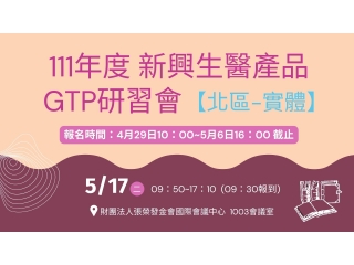 111年度「新興生醫產品GTP研習會」-北區實體場次報名課程編號:111-TFDA-3111年度「新興生醫產品GTP研習會」-北區實體場次報名上課日期:2022-05-17講師:已截止 -