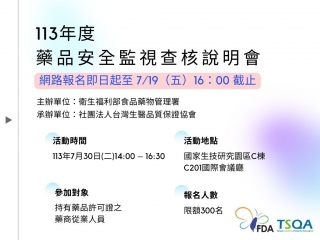 113年度藥品安全監視查核說明會課程編號:PV-1130730113年度藥品安全監視查核說明會上課日期:2024-07-30講師:已截止 -
