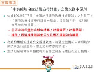 宣導事項「申請細胞治療技術施行計畫」之函文副本原則