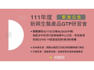 111年度「新興生醫產品GTP研習會」-實體場次新規定本活動實體場次,將配合中央流行疫情指揮中心公告:參與具有會接觸不特定人士或無法持續有效保持社交距離性質的活動, 符合接種年齡之參加者須完成COVID-19疫苗追加劑(第3劑)接種... -