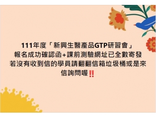 111年度「新興生醫產品GTP研習會」 報名成功確認函+課前測驗網址已全數寄發報名成功確認函+課前測驗網址已全數寄發